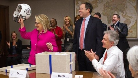 Die US-Außenministerin Hillary Clinton kehrte gestern nach einem Monat medizinischer Abwesenheit an ihren Arbeitsplatz zurück. Kollegen begrüßten sie mit Applaus und überreichten ihr ein Geschenk – einen Footballhelm mit dem Emblem des Außenministeriums.