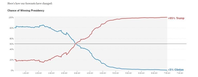 Umfragen vor den Wahlen deuteten auf einen Sieg für Hillary Clinton mit einem durchschnittlichen Vorsprung von fünf Prozentpunkten hin, und eine Umfrage von Reuters/Ipsos sagte voraus, dass sie eine 90-prozentige Chance hatte, das Weiße Haus zu gewinnen, was sich über Nacht vollständig zugunsten von Trump umkehrte.